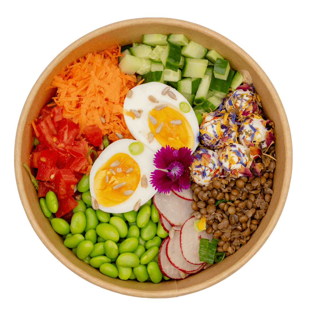 Quinoa, vinaigrette, fromage du moment, oeuf mollet, légumes et fruits du moment, lentilles, touches finales du moment.