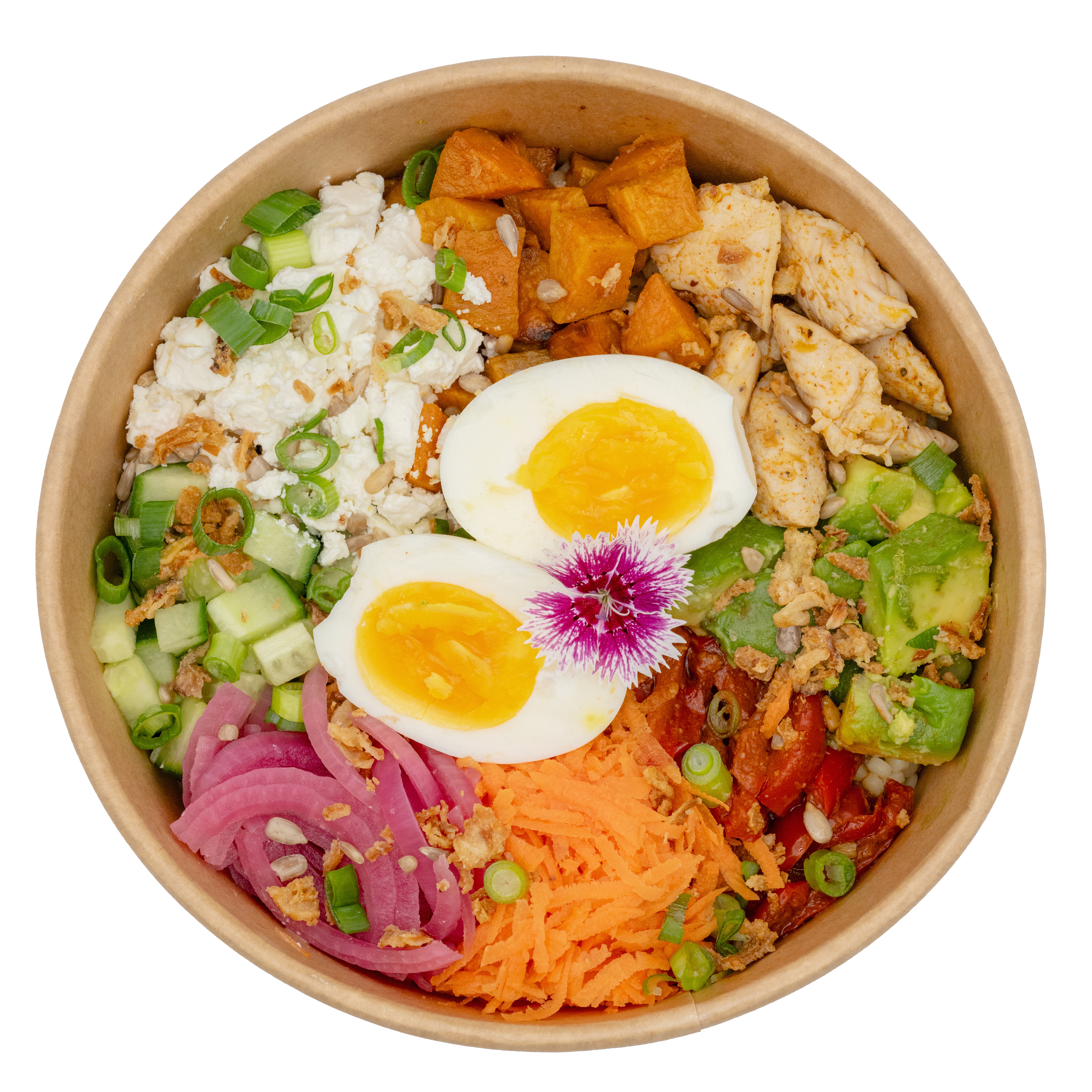 Couscous Perlé, poulet, sauce teriyaki, oeuf mollet, légumes et fruits du moment, touches finales du moment.