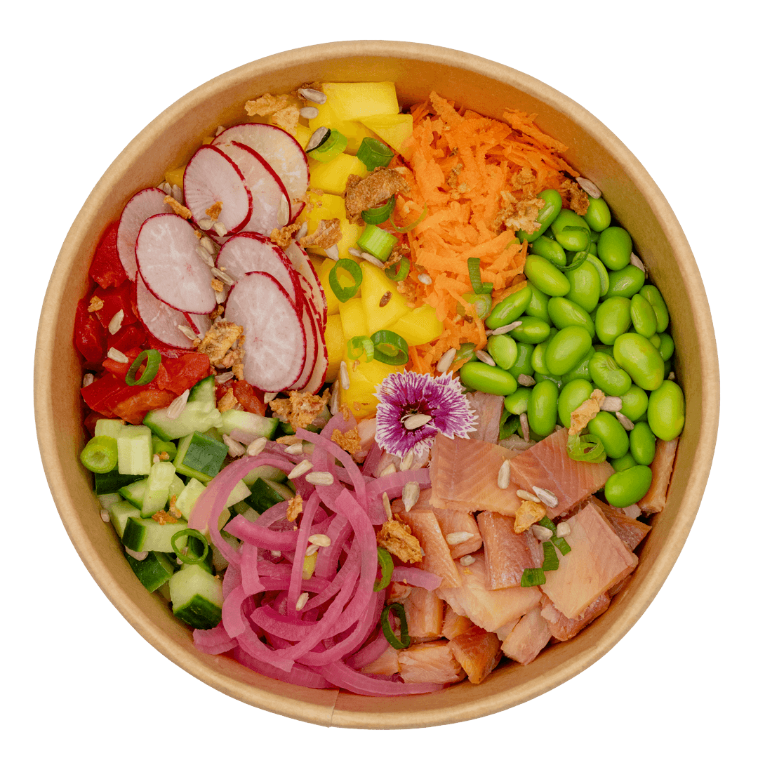 Riz basmati, truite fumée, sauce teriyaki, feta, légumes et fruits du moment, touches finales du moment.