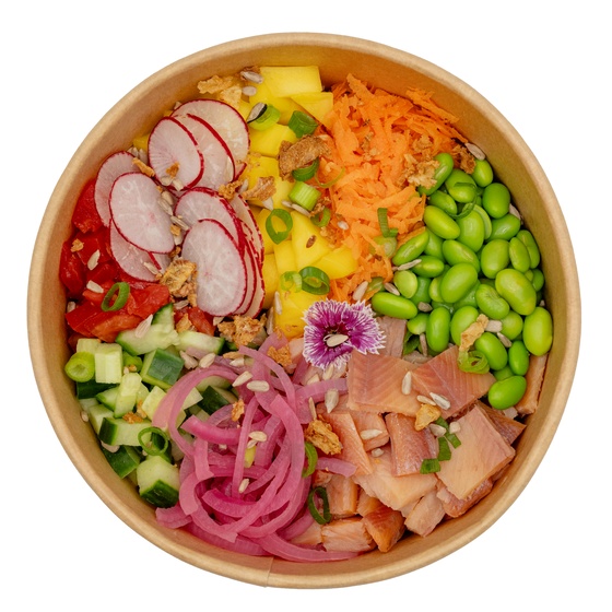 Riz, sauce teriyaki, feta, fruits et légumes du moment, touches finales du moment.